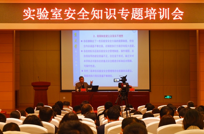 为进一步提升全校师生实验室安全责任意识,4月19日上午,国有资产与实验室管理处、保卫处主办召开实验室安全知识培训会,邀请南京大学博士生导师张剑荣教授做“从第十届全国大学生化学实验竞赛学生安全防护习惯谈高校实验室安全建设”主题讲座。