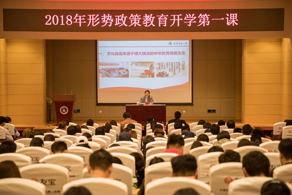 韩金玉在报告中,对文化的内涵、种类、中西文化比较、校园文化和科大文化进行了精彩解读。他从“文化自信来源于博大精深的中华优秀传统文化”、“文化自信根植于中国特色社会主义的伟大实践”、“以习近平新时代中国特色社会主义思想为指导,坚定文化自信,做新时代开拓者”三个方面,梳理了中国共产党人对中华传统文化进行创造性转化和创新性发展,将马克思主义与中华优秀传统文化有机融合,在中国特色社会主义伟大实践中形成中国特色社会主义文化的历史和逻辑脉络,阐释了文化自信的根源、底气和对于实现中华民族伟大复兴的重要意义,并对青年学生以习近平新时代中国特色社会主义思想为指导,坚定文化自信,做新时代开拓者提出具体要求。